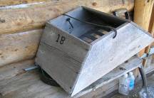 Picture - One of many in stream egg incubation box used on Tozitna River in 1970's and early 1980's. Used for 2000 - 8000 eggs at a time and taken out before ice breakup but after eggs hatched. Did not need upwelling gravel water to incubate eggs as it produced its own when faced into current.