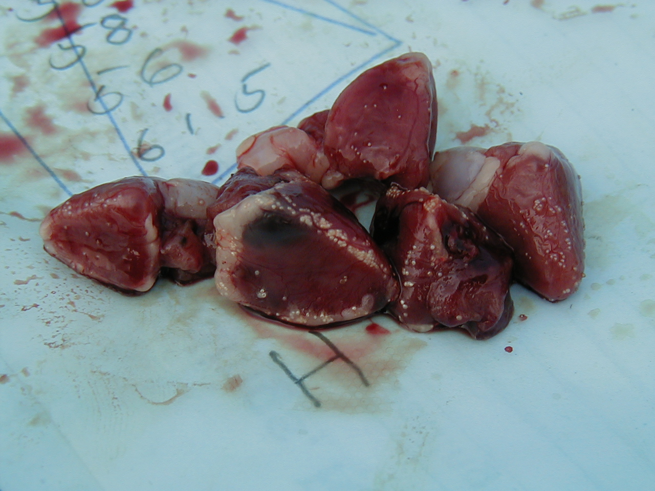 In 2003 this project identified a white spot that was found on some chum and many whitefish hearts simply as “surface white spots” in order to distinguish them from Ichthyophonus (ICH) spores which they were externally similar to. These spots were often mistaken as ICH by many fishermen and the fish sometimes discarded unnecessarily for this reason. While this important information (that is was not ICH) was voiced around the local area and on YRDFA teleconferences it was not until 2005 that the spots were finally identified by name by Joe Sullivan (YRDFA) and Simon Jones (DFO Canada) as meta cercarial trematode, a fluke and harmless to both humans and the fish. As you can see in the video the fluke does not penetrate into the meat of the heart as does ICH but lies just under a thin membrane. So far this has been the only “white spot” seen with any frequency, on fish hearts in this section of the Yukon River, that could be mistaken for ICH. Below a picture on left and video on right.